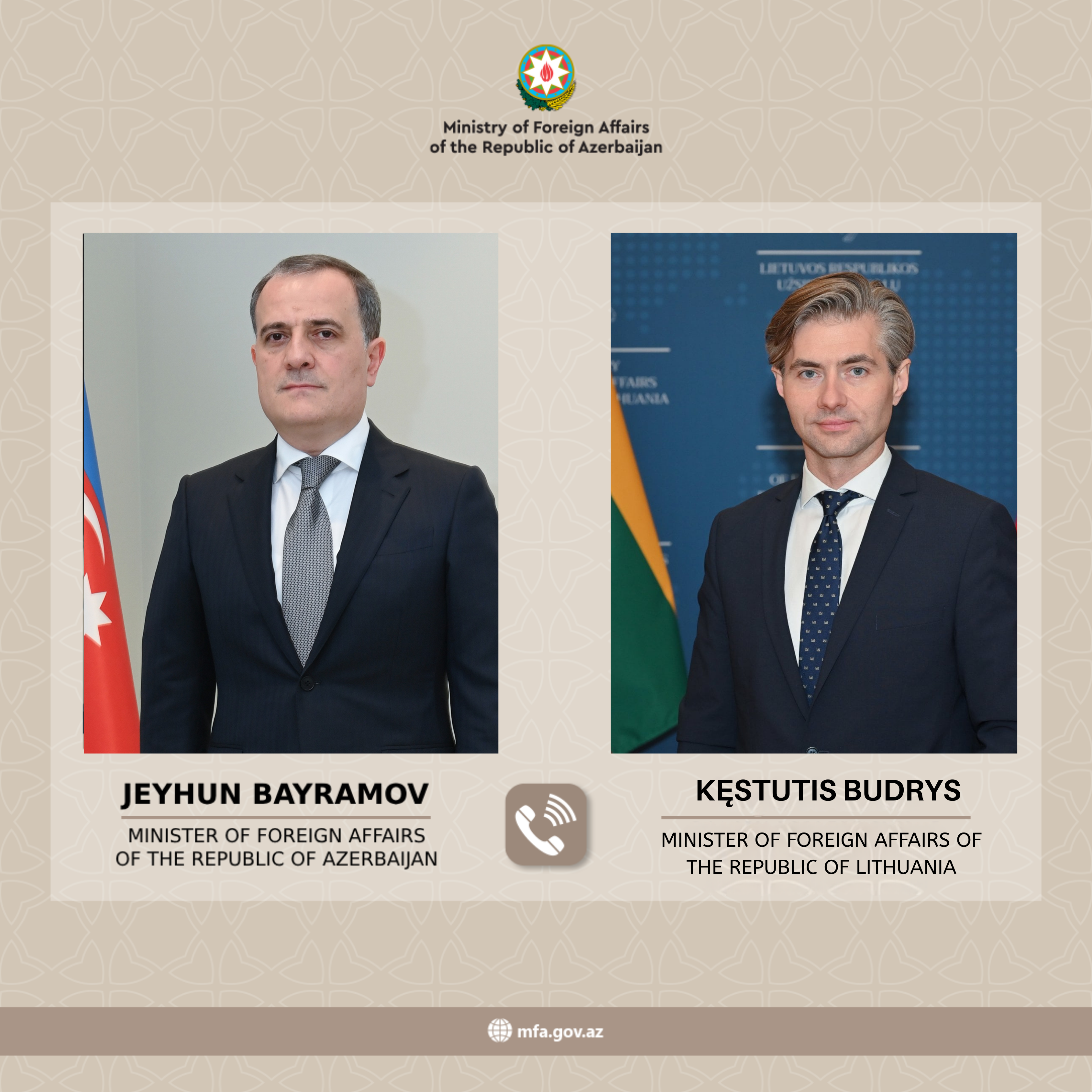 On March 6, 2026, the Minister of Foreign Affairs of the Republic of Lithuania, Kęstutis Budrys, held a phone call with the Minister of Foreign Affairs of the Republic of Azerbaijan, Jeyhun Bayramov.