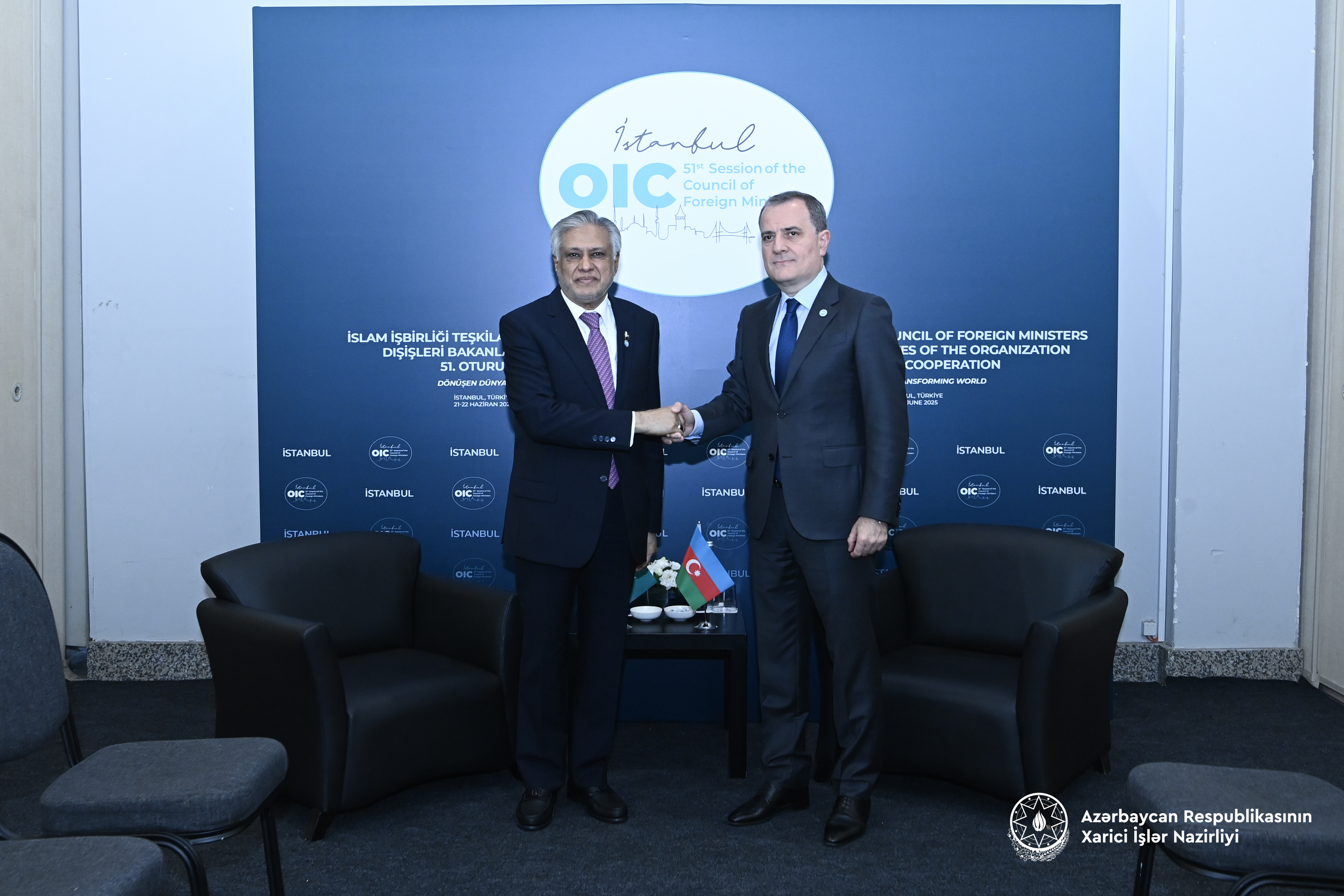 On 22 June 2025, the Minister of Foreign Affairs of the Republic of Azerbaijan, Jeyhun Bayramov, met with the Deputy Prime Minister and Minister of Foreign Affairs of the Islamic Republic of Pakistan, Mohammad Ishaq  Dar, within the framework of his participation in the 51st session of the Council of Foreign Ministers of the Organization of Islamic Cooperation (OIC).