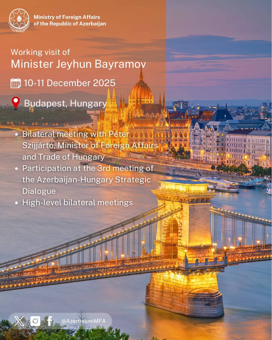 10 dekabr 2025-ci il tarixində Azərbaycan Respublikasının xarici işlər naziri Ceyhun Bayramov Macarıstana işgüzar səfərə yola düşüb.